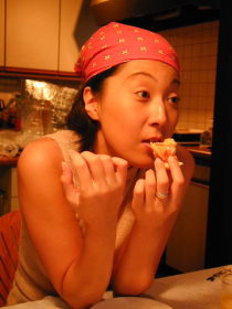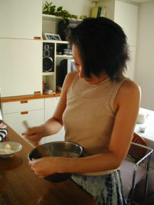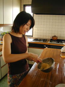 | 今日は、前回参加のきじぽんが急用で参加出来ず、ほっしーも遅刻のため、まっつー、みきさん、そして私の3人でクッキングパーティー開始となりました。 まっつーもみきさんも、頑張って混ぜてます。ここで頑張って混ぜるとあとが楽になるからね。 |