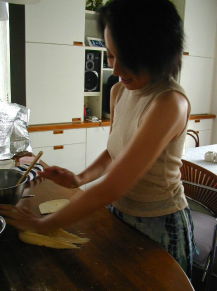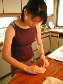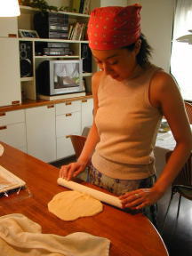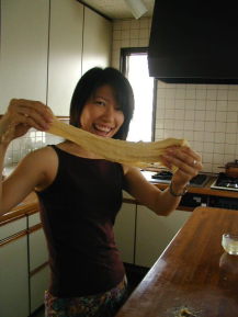 | 粉っ気が無くなるまで混ぜたら、いよいよ 台の上でこねていきます。 ←おーい、まっつー遊んでる場合じゃないぞー。 真剣ながら楽しそうなみきさん→ |