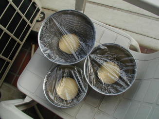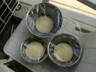 | こね上がったらいよいよ発酵します。 今日はすごく暑かったので、ベランダに出して 発酵させることにしました。一番大きいボウルが みきさん、真ん中がまっつー、小さいボウルが 私がこねたもの。 |