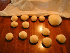 | 今日は3種類のパンを作るので、 こんなに分割しました〜。 う〜ん、大きさがバラバラ。。。 |