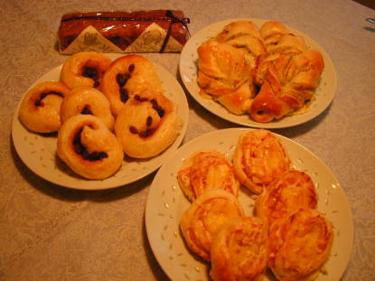 | 奥がバジルチーズツイスト。左がシナモンロール、 手前がハムマヨパン。 ちなみに、奥のパウンドケーキは、今朝焼きました。 明日、会社のみんなで食べてくださいね>さこさま。 |