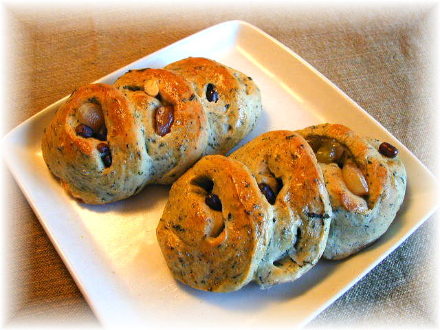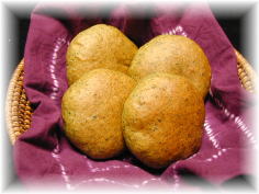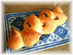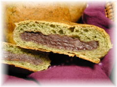 | ← 今日のパン 「よもぎあんぱん」 よもぎの戻し方をakiちゃんに教わって(ちゃんと最初から説明書きは読んで下さいね〜>aki)、今日は先週のよもぎパンよりは緑がきれいに出ているような気がします。真ん中にあんこを詰めて、天板に並べた時は、まるで「よもぎ大福」。手のひらでぺっちゃんこにつぶして焼いてみました。 |