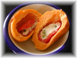 | 横浜駅東口の、ポルタのなかにある「パンペパート」という、 イタリアのパン屋さんのパン。 その名も「ボンバ・ディ・モモタロウ」 以前、彼が偶然見つけたパン屋さんで、今日はぜひ一度食べてみて、とお店に連れて行ってくれました。見ての通り、トマト型に成形されたパンを切ると、中には桃太郎トマトが丸まる一個入っています。なかには、自家製リコッタチーズクリームと豆が入っています。味は、チーズが入っていますが、結構さっぱり目ですね。トマトのジューシーさがちゃんと残っていました。1つ\280なり。高いです。 もし、お近くにお立ちよりの際は、一度お試しあれ。 |