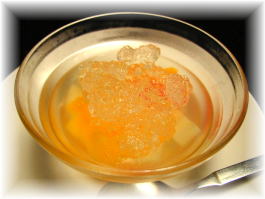 | ←「パッションフルーツワインゼリー」 こういう暑い時期には、つるんと食べられるゼリーとかが恋しくなります。 昨日、パッションフルーツのワインでゼリーを作りました。 中には、フルーツカクテルの缶詰を入れて、固めてあります。 アルコール分を適度に飛ばしたつもりなのですが。。。。 アルコールが一滴も駄目な私。。 夜、ゼリーを食べてしまったら、寝るときには、心臓がバクバクいって しまいました(^_^;)。やっぱり、飲んではいけないらしい。。。 むー。自分で作っておきながら・・・(^^ゞ |