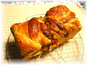 | 今日のパン 「ジェノベーゼ(?)」 一昨日作ったバジルペーストがまだ残っていたので、パンに織り込みました。 写真で見るとなんだかもこもこしてますね。 パン生地を広げて、バジルペーストを塗り、スライスチーズをのせて、くるくるに巻いて。 巻いたものを、3つに切り、三つ編みにしていきます。それを食パン型で焼きました。 3つに切って編んでいるので、内側に巻き込まれたバジルペーストやチーズが表面に出てくるので、焼くとチーズがいい感じに焦げて、バジルの香りもとってもgood! 自分で言うのもなんですが、かなり美味しかったです。 やっぱり、バジルペースト偉大だわ。皆様もバジル育てて作ってみて下さいね〜。 |