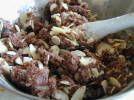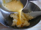 | 3. | 良く溶いた卵を、2回に分けて加え、良く混ぜる。 |