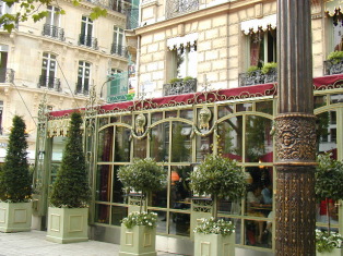 | 「LADUREE」 1862年創業という伝統あるお店ラデュレ。 この写真は、シャンゼリゼ通りに面しているわりと新しいお店です。外観もそうですが、内のインテリアはさらにゴージャスな雰囲気でした。 ここでは、Petit Dejeuner(朝食)をいただきました。絞りたてのフレッシュジュース(オレンジかグレープフルーツ)、パン、そして飲み物(コーヒーか紅茶かココア)。2人で頼んだら、パンは全部違う種類の物を8つ、バターとあんずジャム、ブルーベリージャムと共に持って来てくれました。甘〜いデニッシュ系のパンが多かったです。 ここで一番の驚きは、何と言ってもココア。銀のピッチャーに入れてサーブしてくれるのですが、自分でカップに注いでみてビックリ。トロ〜リを通り越して、ドロ〜っとした濃厚な液体(半固体?)が、、。口に含んでみると、ほんとにチョコレートを飲んでいるみたいでした。ピッチャーには、軽くカップ2杯分は入っていましたが、1杯目でギブアップ。濃いココアが好きな私ですが、私の予想をはるかに越えていました。 ここの名物は「マカロン。」 マドレーヌ広場近くにある本店でお土産に買いました。 |