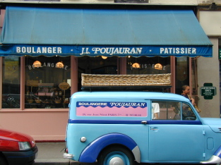 | 「Poujauran」 「プージョラン」。パン屋さんです。 とっても小さいお店なのですが、行列が出来ています。 ピンクの建物に、水色の屋根。同じ色の組み合わせの車が、お店の前に停めてあります。それも屋根には籠付き。 中に入ると、手前には、デニッシュやケーキなど小さなパンやケーキが。そして、お店の方の後ろには、大きな「パン・ド・カンパーニュ(田舎パン)」やフランスパンが所狭しとならんでいます。 「フルート」と呼ばれる細長いフランスパンを買っている人が結構いましたが、そのパンを買うと、ちょうど真ん中辺りを、紙でクルクルっとひと巻きしただけ。本当に簡単な包装です。その紙で巻いた部分を手に持ち、6〜70cmはあると思われるパンのほとんどがむき出しの状態なのです。お〜、さすがフランス。となんだか妙に感激してしまいました。 ご主人のプージョランさん、本で見た写真ではとってもハンサムな人だったので、会えたらいいな〜、なんて思っていたのですが、会えませんでした。残念(^^ゞ |