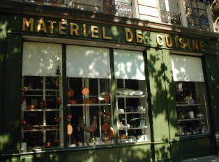 | 「Dehillerin」 パリに行ったら絶対に行きたいと思っていたのがこちらのお店「ドゥイルラン」。写真にも「マテリアル・ドゥ・キュイジーヌ」って書いてありますけど、調理器具・製菓道具のお店です。 入ってみると、ホントに床から天井まで物にあふれています。天井からは、ケーキの型がぶら下がっているし。例えば、ケーキのクリームを塗ったりするヘラなども、長さが何種類もありました。どちらかというとプロ向けのお店なので、業務用の道具も沢山売っていました。私の身長よりも長いような巨大な木べらにはびっくり。 見ているといろいろ欲しくなってしまうのですが、あんまり沢山買いこみ過ぎても、ホテルまでの道のりも大変なので、それほど重くない道具をいくつか購入。旅行客も結構いたのですが、重いパエリヤ鍋を3つも買おうとしていて、持って帰る方法を思い悩んでいるお客さんもいました。。。 |