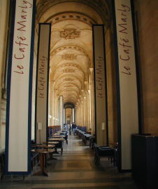 | 「Le Cafe Marly」 ルーブル美術館の中にある「カフェ・マルリー」 ルーブルの建物の一角にあります。 この空間の広さが、何とも言えず素敵です。 広さはそれほど無いのですが、この天井までの高さのせいで、何とも言えない開放感のようなものがあります。 朝8時から開いているので、ここで朝食をとって、エネルギーをつけてから、ルーブル美術館に行くのもいいですし、ルーブルを見て疲れた体を、ほっと一息休ませるというのもいいかもしれません。 写真のテラスの部分は、全体的に青のイメージ。椅子には青いカバーがかけられています。ルーブルの中庭、ガラスのピラミッドや、向かい側の建物を眺めながらリラックス。 一方、中に入ると、赤のイメージ。 壁は真っ赤に塗られ、インテリアもゴージャスな金色の物が多くなります。すっきりしたイメージのテラスとは対照的に、こちらも素敵な空間です。 |
