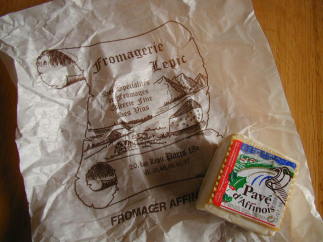 | 上のお店で購入したパヴェ・ダフィノワというチーズ。 パヴェというのは、石畳という意味で、その名の通り 四角い形をしています。 お店のロゴの入った紙に包んでくれました。 この紙、内側に薄いビニールが貼ってあります。 もう一つ、カマンベール・ド・ノルマンディーAOCも 買ったのだけど、こちらは写真に取る前に食べて しまいました。熟成が進むと、中がとろとろになる らしいのだけど、まだまだみたいです。賞味期限まで あと2週間なのですが、その頃までにはとろとろに なるのかなぁ? |