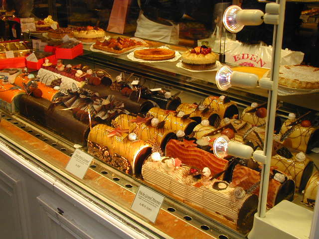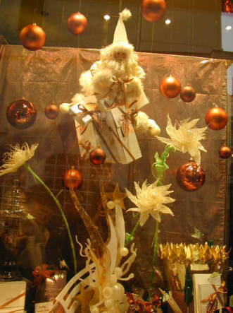 | ←ショーウィンドーに飾られていた飴細工。 クリスマスらしく、可愛らしい飾り付けがされて いました。 ↓そして、こんなに沢山のブッシュ・ド・ノエル。 パリのケーキ屋さんは、本当にどんなに小さなお店 でも沢山のブッシュ・ド・ノエルが置いてありました。 サイズのいろいろで、一人用のミニサイズまで。 ブッシュ・ド・ノエルというと、チョコレート味のものが 多いイメージを持っていましたが、こんなにいろいろ あるんですね。いろいろある中でも、やっぱり ジェラール・ミュロのケーキは洗練されているというか、 華やかで美しいものが多かったです。 |