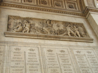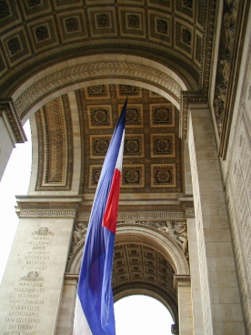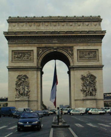 | パリの観光名所、というと、まず思い出すのがこちらの凱旋門。シャルル・ド・ゴール広場の中心にそびえ立っています。 ナポレオンの戦勝を記念して、皇帝の軍隊に捧げるためにつくられたものだそうです。1806年に着工、完成は1836年。 ジャン=フランソワ・シャルグランという人の設計で、幅45m、高さは50mもあります。外壁には、フランス軍を称えた彫刻で覆われています。近づくに連れ、その大きさに圧倒されます。 私が行った時には、ちょうど、中心部分に大きなフランス国旗が下げてありました。ちょうどこの真下ぐらいに、無名戦士の墓があります。この門の建築を命じたナポレオン自身は、生きている間にその完成を見ることは出来ず、遺骸として、この門の下をくぐることしか出来なかったそうです。 この門、頂上に登ることが出来ます。螺旋階段をぐるぐるぐるぐる。そろそろ目が回って息切れしてきた頃に、やっと頂上に辿り着きます。頂上に登ると、ここを中心に放射状に広がっている12本の通りをぐるっとみわたすことができます。 |