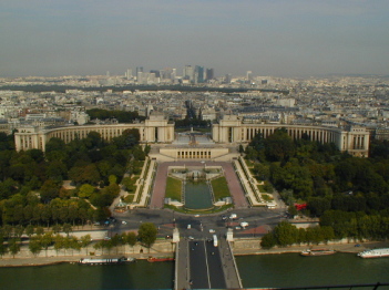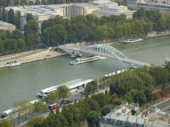 | エッフェル塔の展望台から見たシャイヨー宮。大きく翼を広げたような形をしています。 | エッフェル塔から見たセーヌ河。この後、バトー・ビュス(水上バス)に乗りました。 |