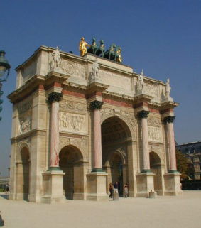 | チュイルリー公園内にあるカルーゼル凱旋門。元祖凱旋門と言われています。 こちらも、エトワール凱旋門と同じく、ナポレオンの戦勝を記念して、同じ1806年から建設が始まり、2年後の1808年に完成しました。 エトワール凱旋門よりは少々こじんまりとした感じ。 ルーブル美術館、からまっすぐこの門の下をくぐると、シャンゼリゼ通りのずーっと先にエトワール凱旋門。一直線に並んでいます。 |