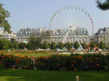 | カルーゼル凱旋門を過ぎるとチュイルリー公園が広がっています。このチュイルリーという名前、昔、この辺りの土を使って瓦を作っていたことからチュイルリー(瓦製作所)という名前がついたそうです。 ここには観覧車がいくつもありますが、日本のそれとはずいぶん違うようです。なにぜ、スピードがめちゃくちゃ速い。ちょっと恐怖感を感じるほどのスピードです。見てるだけで恐くなったので、乗るのは遠慮しておきました。 |
