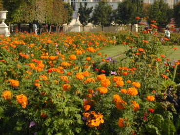 チュイルリー公園の中には美しく花壇が整えられています。雲一つ無い空の下、色鮮やかに咲いていました。 近くの噴水の周りには、長椅子が並べてあって、日光浴を楽しんでいる人達がいっぱいいました。 私は庭園の知識はないので、良く知らないのですが、ル・ノートルという造園家が設計したフランス式のていえんだそうです。 |