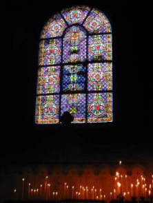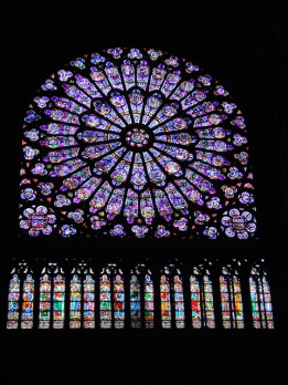 そして、このバラ窓。ステキですよね。これらのステンドグラス、合わせて600uもあるそうです。 この空間に入った瞬間、このステンドグラスの光に包まれるのは、なんとも不思議な感じです。暗い教会の中にステンドグラスの光というのとはちょっと違います。壁がすべてステンドグラスという感じですからね。 |