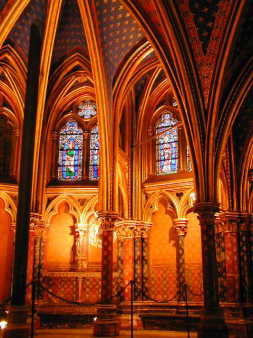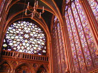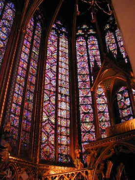 | サント・シャペル。1248年完成の聖堂です。 このステンドグラス。すごいです。 創世紀、出エジプト記、、、と聖書の物語を題材にステンドグラスが作られています。 この聖堂は、聖王ルイが聖遺物を保存するために作った私的な聖堂だそうです。 |