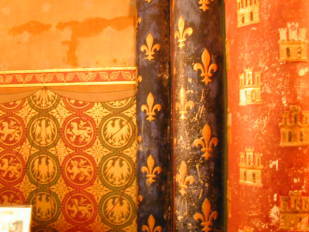 壁面や柱には、フランス王朝の白百合の紋章や、様々な装飾がされています。いろも、赤、青、緑、金ととても鮮やかです。面白いのは、あたかも布をかけてあるかのように絵が描いてあること。写真の左側おわかりいただけるでしょうか?ちょっと仏教装飾にも通ずるようなイメージを受けました。 |