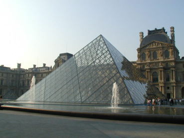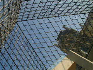 | ガラスのピラミッドを内側から見たところ。近年作られたこのピラミッドとその向こうに見える歴史を重ねた建物の不思議な調和。 | このピラミッドが入口。ここで荷物のX線検査があります。空港みたいな感じ。朝早かったのですが、すでに長〜い行列が出来ていました。 |