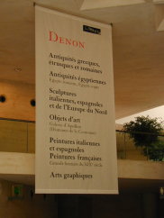 大ピラミッドの真下に、それぞれドゥノン翼、リシュリュー翼、シュリー翼へ進む階段があります。それぞれこのように垂れ幕がかかっていて、どういった作品の展示があるかかかれています。これはドゥノン翼。 |