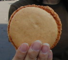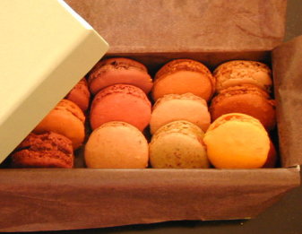 | パリのお気に入り。マカロン。 周りはメレンゲとアーモンドパウダー、砂糖、粉などを混ぜて焼いたもの。さくっとした食感です。間にクリームやジャムが挟まっています。チョコ、コーヒー、ラズベリー、レモン、ピスタチオなどなど、いろーんな味があります。 |