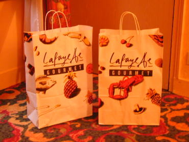 | 「ギャラリー・ラ・ファイエット」の食品館、「ラファイエットグルメの紙袋。 かわいらしいですよね。 大きなロブスターの絵や、パイナップル、バナナ、さくらんぼ。いかにも食品館って感じ。 ここは、普通のスーパー兼お惣菜やさんという感じでした。お惣菜やさんでは、いろいろグラム売りで売ってくれるし、御土産になるようなものも、結構安く売っています。最近は、日本のデパ地下も元気ですが、パリのデパ地下も元気でした! |