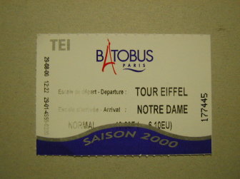 | 水上バスの切符。エッフェル塔〜ノートルダムまで40フランです。でも、この切符売場、あまり詳しく値段を表示していません。1日券65フランとは表示してありますが。でも、フリーパスなんて要らないし「ノートルダムまで行きたいんですけどいくらですか?」と聞いてこの切符を買いました。水上バスを待つ間、隣にいた日本人の人達(65フランの切符を持っていた)が、「何であの人は安い切符を持ってるのかしら?」ってな感じでこそこそ話しているのがちょっと聞こえて、ちょっとでもフランス語話せて良かった、と思ったのでありました。 | |||
