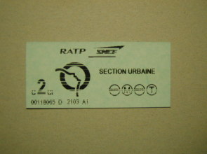 | パリのメトロ(地下鉄)の切符。 この切符一枚で、大体どこでも行けます。日本みたいに、距離によって金額が変わったりはしません。この切符でバスにも乗れるようです。でも、それを知ったのは日本に帰って来てからでしたが、、(~_~;) この切符を自動改札機に入れ、出てきた切符を取り出し、レバーをガッチャンと前に押して改札を通ります。降りる時は、特に切符は必要ありません。日本のように、入口にも出口にもなる改札ではないんですね。出口はただの扉のような感じです。一度改札を通った切符は、ブルーのスタンプみたいのが押されてます。 |