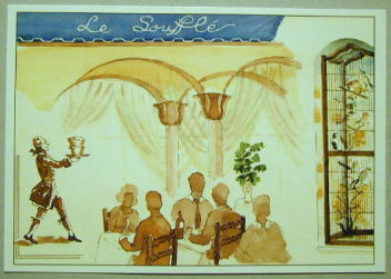 | スフレのお店「ル・スフレ」のポストカード。 料理を食べ終わった頃に、お店の方がプレゼントして下さいました。 写真がちょっと小さいのでわからないかもしれませんが、左の方の人が、山盛りに膨らんだスフレを持っているのがお分かりいただけるでしょうか?本当にこんな感じのスフレでした。 右の方に描いてある鳥かご。 お店に実際ありました。中の鳥は作り物なんですけどね。 |