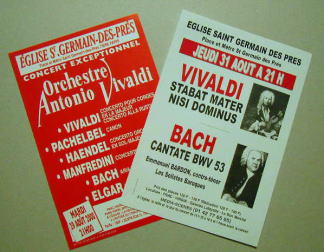 | サンジェルマン・デ・プレ教会で見つけたコンサートのポスター。 こんな赤いビラがいっぱい置いてありました。パリでは教会でコンサートが行われる事が多いようです。サンド・シャペル教会でも、コンサート日程がびっしり書いてあるカレンダーが置いてありました。 教会という神聖な空間で奏でる音楽。 とても素敵な響きなんだろうなぁ。 |