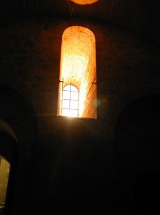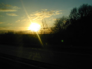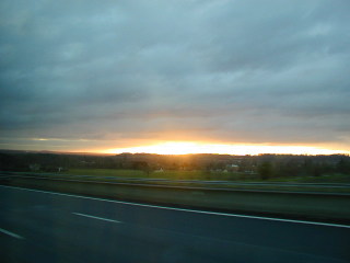 | パリからモンサンミッシェルまでは、バスで4時間ほどの道のり。まだ夜明け前に出発します。 車窓からの日の出の写真。 |