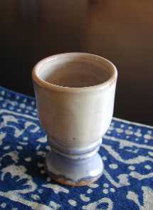 このカップは、3段階に分けて色をつけました。まず、下半分に藍色の釉薬をかけ、次に上半分に空色の釉薬をかけます。それが乾いたら、最後に全体に白色の釉薬をかけてみました。