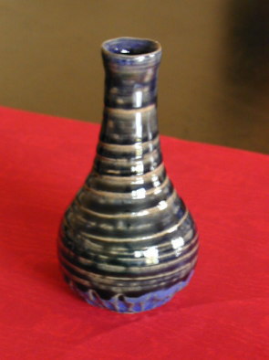 | 花瓶です。 珍しく、ちょっと濃い色をつけてみました。 焼いてみると、表面の凸凹に合わせて、色が着いたり着かなかったり、面白い雰囲気になりました。 これは、作ってる途中で底に穴が空きそうになり、ちょっと冷や汗モノでした。 |