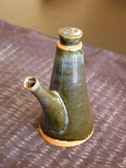 | 醤油差しです。 作り始めてからも、どういう形にしようかとっても迷っていたのですが、ふと思いたって、ちょっと直線的な形に仕上げてみました。 最初は、つやが無い黒の釉薬をかけようとかと思ったのですが、違う色の釉薬を黒の上からかけたら、やっぱりちょっと面白い感じに仕上がりました。 |