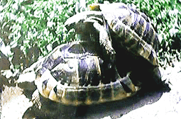 1回に1個、最高でも年間3―4個しか卵を生まないので、商業ベースのブリーディングはほとんど行われていないようです。原産地でもかなり生息数が減少しているようで、この様な種類こそ何とか我々アマチュアの手で殖やしていかなければならないものだと思います。私の所でも以前ペアで2回産卵したのですが、孵化にはいたらず、残念なことにそのペアも、ホシガメのところで述べた「伝染性の呼吸器疾患」により失ってしまいました。現在の2頭に期待をかけているのですが、この種の場合ある程度数多くの個体を集めたコロニーで飼育した方が、繁殖の可能性が高いといわれています。