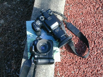 | 誰もが一目置く、NikonのフラッグシップF5。そして、今回はデジ一眼を持ってきました!なんと、D2Hです。レンズはサンニッパから、明るい怒濤のズームまで、機材をお金に換算したら・・・。怖い。。。 | 管理人は、ペンタの645とNikonのF80D。そして、レポート用には今回からデジカメを導入しました。とは言え、一昔前のロースペックのヤツです。 |