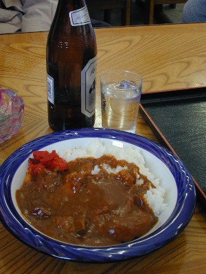 | 単線の線路がなんともいいです。なんだかゆっくりとした弛緩が流れていく感じです。 | 一回目の撮影終了後、昼食としました。昼食メニューは、管理人とhonma君がカツカレー、ついでにビール。yasuさんが生姜焼定食、むろさんがチャーハンでした。 |