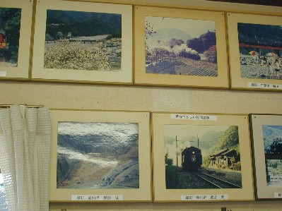 | 今回、昼食をとったのは、川根温泉笹間渡駅近くのうりやさんです。このうりやさんは、毎日のように鉄道写真ファンの方が訪れる場所です。SL日記があって、来られた方が、記念に書いていくそうです。せっかくなので、管理人も足跡を残してきました!! | うりやさんの店内には、所狭ましとSLの写真でいっぱいです。全国から訪れるSLを撮る人の作品が飾られています。 |