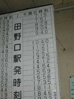 | 田野口駅の時刻表です。朝の通勤時間帯でもこの本数です!正直、都会じゃ考えられないです! |