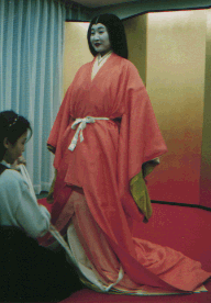 ![]() 唐衣に裳をつけてできあがり。 |