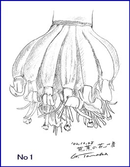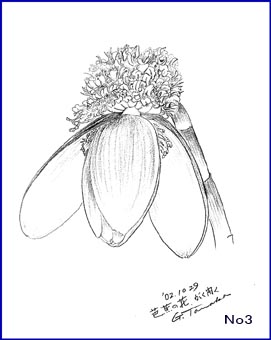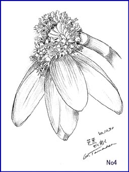 この夏はことのほか暑かったためか、庭の芭蕉が例年より大きな花を付けました。間もなく霜が降りると一夜でしおれてしまうので、切り落としてアトリエに入れました。観察してみると細やかな花の部分と大きな「がく」の部分との対比がおもしろい。自然の造形美は人間が作り出した造形物をはるかに越えています。私のスケッチは、版画を制作するための取材にすぎないが、この作業によってさまざまなアイディアが生まれます。版画作品は抽象にちかい表現にしています。この段階では主観をいれず目に映ったものを忠実に描き表すようにす。