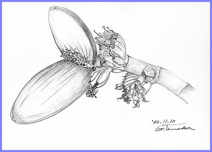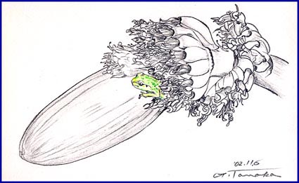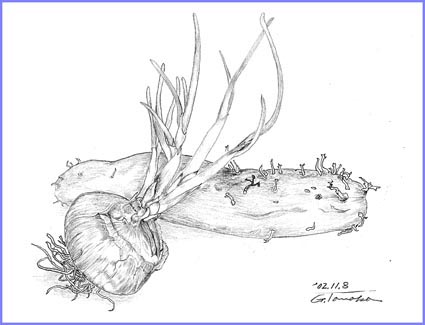 芭蕉の間に異質なスケッチがはいっています。ここ二日ばかり芭蕉が変化しなくなったのです。いよいよ「寒さに負けたか、それとも俺の根気に芭蕉も負けたな。」と誇らしく思いました。そこでお勝手に食べ忘れていた玉葱などを描いていました。ところが、今朝(11月10日)仕事場に行ってみると動いているのです。がくを広げているのです。自然の力は侮れません。まだまだこの挑戦続きそうです。