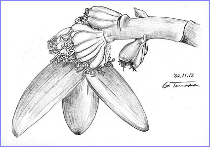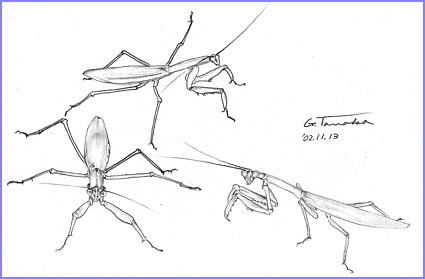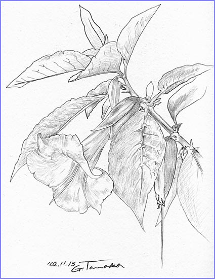 変化の少ないページをご覧頂きありがとうございます。芭蕉のスケッチは、対象が枯れ果てるまで続けますが、ご覧頂くみなさんにとっては退屈になってきたと思います。そこで来週からは、新しい仕事を紹介します。北関東の深谷でも、日増しに寒さが厳しくなり霜の降りるのも間もなくと思われます。霜が降りると一度にしおれてしまうトランペットを描きました。その葉陰に夏の間、権威を振りまいていたカマキリが哀れにも動きを鈍くしてジーッとしていました。昆虫類や鳥類などは正面から描くことは難しいものです。苦労しました。それでも消しゴムをつかわない、うすく見当描きをしないが私の主義ですから一気に描きました。どうでしょうか。