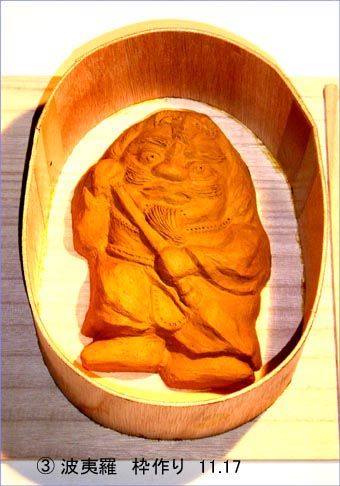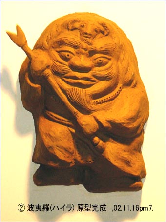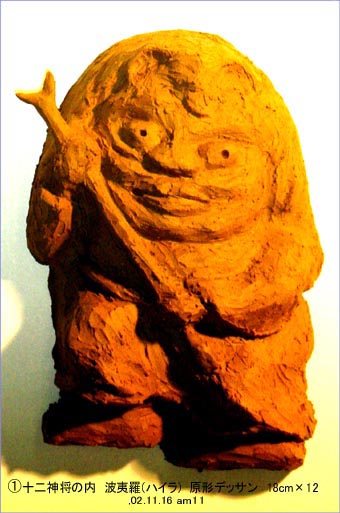 3週間余り、芭蕉を軸にスケッチを続けてきました。昨日からスケッチと陶芸、木口版画を並行して仕事を進めることにしました。今回ご覧頂く陶芸は、十二神将の内、波夷羅という神さん作りです。薬師さんの周りには十二神将という神さんが、薬師さんのお手伝いをしています。名の通り十二人の神さんです。その一人が波夷羅(ハイラ)という神さんです。十二神将は十二方位を守ると同時に歳神様とも言われています。波夷羅は来年の羊年の神さんです。そこで波夷羅の原型を粘土で作り、石膏取りをして沢山の作品を作ることにしました。来年の年の初めにご挨拶にお出でになった方に、お年賀として差し上げようと思います。制作過程については写真をごらん下さい。くわしく知りたい方はメールでお問い合わせ下さい。問い合わせ先。