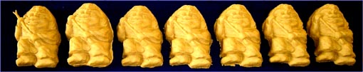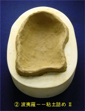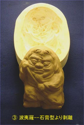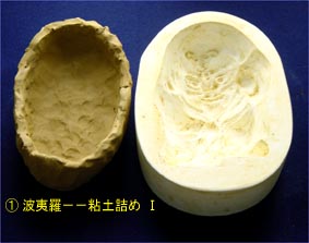 今回の作品は、素焼き焼成のの後、アクリル絵の具で彩色し壁掛け風に仕上げます。石膏型を取ってから、水分が完全にぬけるまで乾燥させます。粘土を詰めて型抜きをする作業は、添付してある写真を参考にしてください。この作品は半立体のように厚みのありますので、石膏型と剥離するのにややぬけにくいのです。そこで石膏の上面につまみの部分を1cmくらい盛り上げておきます。念入りに粘土を詰め込んだ後、このつまみを使って揺り動かすようにしながら剥離させます。少しの体験でマスターできます。経験のない方は浅いレリーフから始めると良いと思います。ご意見、ご質問とうがありましたら下記までメール下さい。