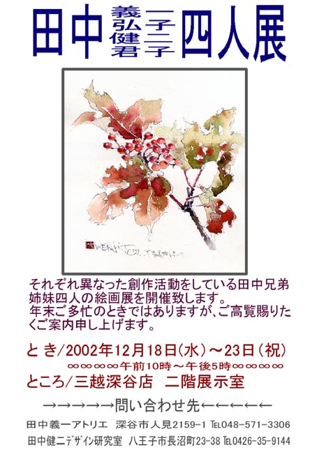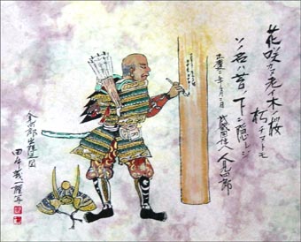 | 埼玉県立博物館では「太平記絵巻」を収集所蔵しています。最近では外国にいっていた第6巻 購入し絵巻展を開きました。私の住む深谷市人見には、太平記の時代に「人見四郎」という武将がおりました。この近くで「太平記絵巻」描かれている武将は人見四郎だけです。四郎は元弘3年(1333)2月河内赤坂城攻めに先陣となって戦死しました。出陣のさい天王寺の鳥居に「花咲カヌ老木ノ桜朽チヌトモソノ名ハ苔ノ下ニ隠レジ」と辞世の句を書き残しておきました。絵巻の中に人見四郎を捜し当てた後、その模写と版画を作っておきました。 12月18月(水)から12月23日(祝)まで深谷三越店に於いて、義一兄弟展を開催します。お近くの方は是非お出で下さいますようご案内致します。