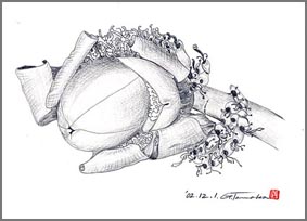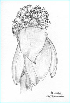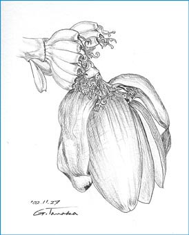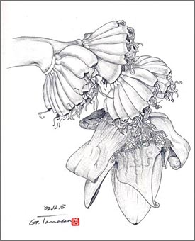 | 同じ対象を一ヶ月半も描き続けたのははじめてです。彩色してしまおうという誘惑にかられたときもありましたが、がまん強く鉛筆一本を通しました。同じモチーフのスケッチ五十枚を並べてみると、作品の善し悪しはともかく、生命の神秘さを感じます。南の芭蕉が私の近くにいつ頃から入ってきたのかはわかりませんが、暑い地方独特の植物の雰囲気があります。田中一村という画家が都会を捨て南の島で制作活動を続けようと志した心情が理解できるような気がします。今まで年1.2回の個展を開いてきましたが、抽象的な雰囲気の作品が多かったので、今回はより具象的なこの作品を展示します。みてください。 |