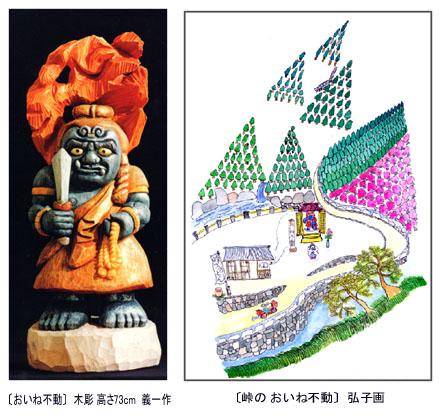 | 群馬県上野村から下仁田に通じる塩ノ沢峠に「峠のうどんや」があります。このうどんやさんに、おいねさんというおばあさんがおりました。「わしの家の近くにお堂があります。不動さんがおったのですが、戦争の後、盗まれてしまいました。今は空のお堂を拝んでいます。」という話しをおいねさんから聞きました。「それではオレが不動さんを作る。」と制作したのが〔おいね不動」です。〔おいね不動〕は開眼して新しい小さなお堂を作ってもらって峠に立っています。おいねさんは亡くなりましたが、名物の「峠のうどん」は愛娘に受け継がれています。メニューは大盛り山菜天ぷらうどんと、こんにゃくおでんのみです。峠のうどんや 問い合わせ 群馬県多野郡上野村楢原799 0274-59-2764 |